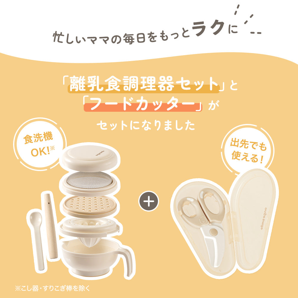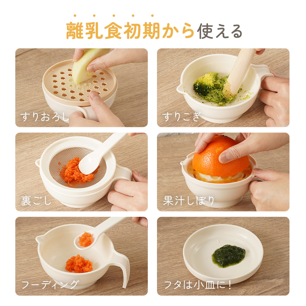 | 商品の特徴 | ・初めての離乳食作りに、離乳食初期に最適な調理器セット。 ・すりおろし、すりこぎ、裏ごし、果汁しぼり、フーディングがしやすい! ・重ねてひとまとめに収納OK。 ・統一感のあるベージュカラー。 ・裏面滑り止めで安定感をプラス。 |