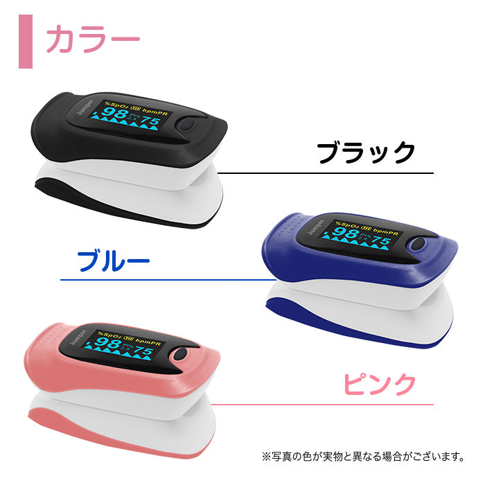 指先に装着して血中酸素飽和度を測定する医療機器です。