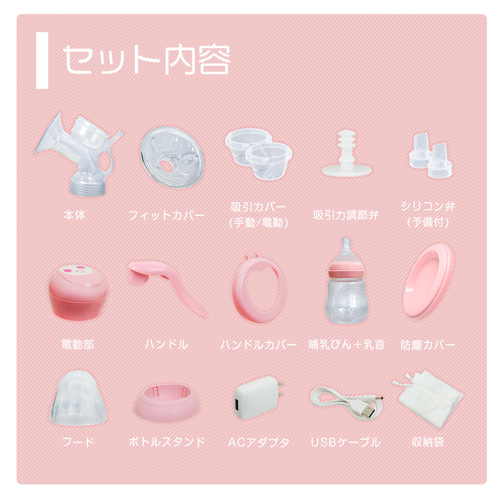 | セット内容 | ・さく乳器本体 ・フィットカバー ・防塵カバー ・ハンドル ・ハンドルカバー ・手動用吸引カバー ・電動用吸引カバー ・シリコン弁 ・吸引力調節弁 ・プラスチック製哺乳びん ・乳首 ・フード ・ボトルスタンド ・電動部 ・USBケーブル ・ACアダプタ 付属品の各パーツの詳細は取扱説明書に記載 |