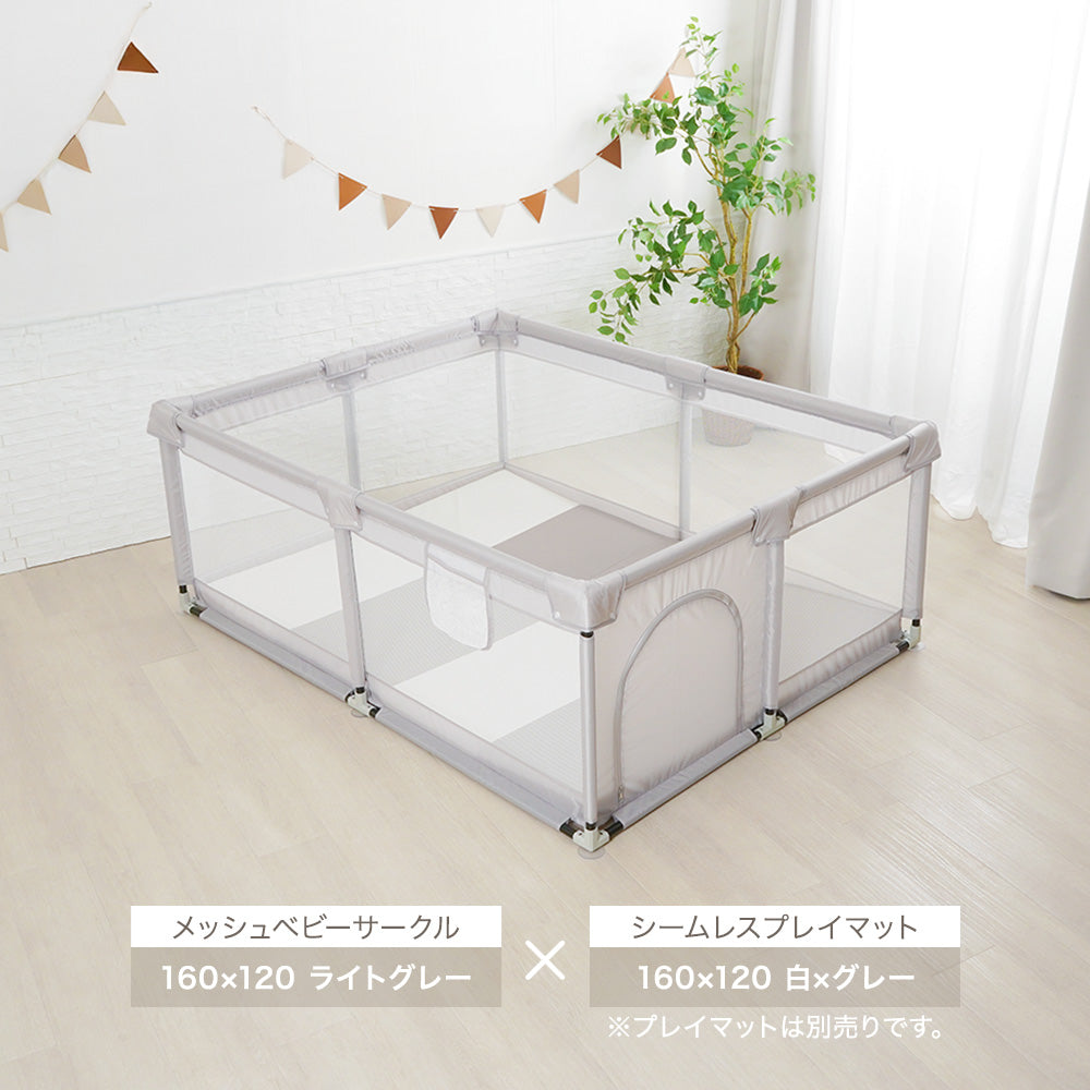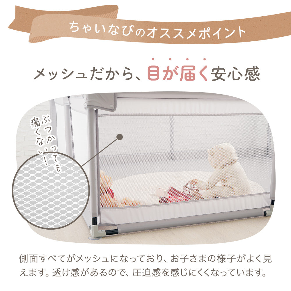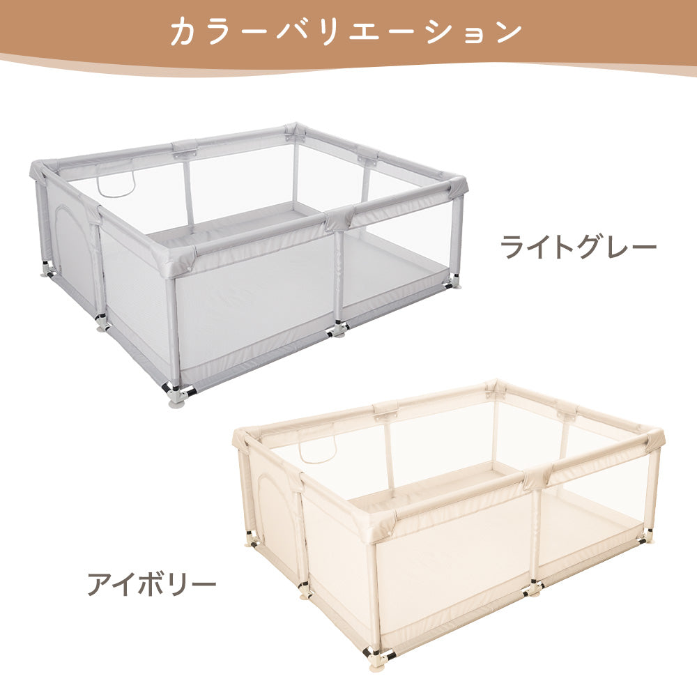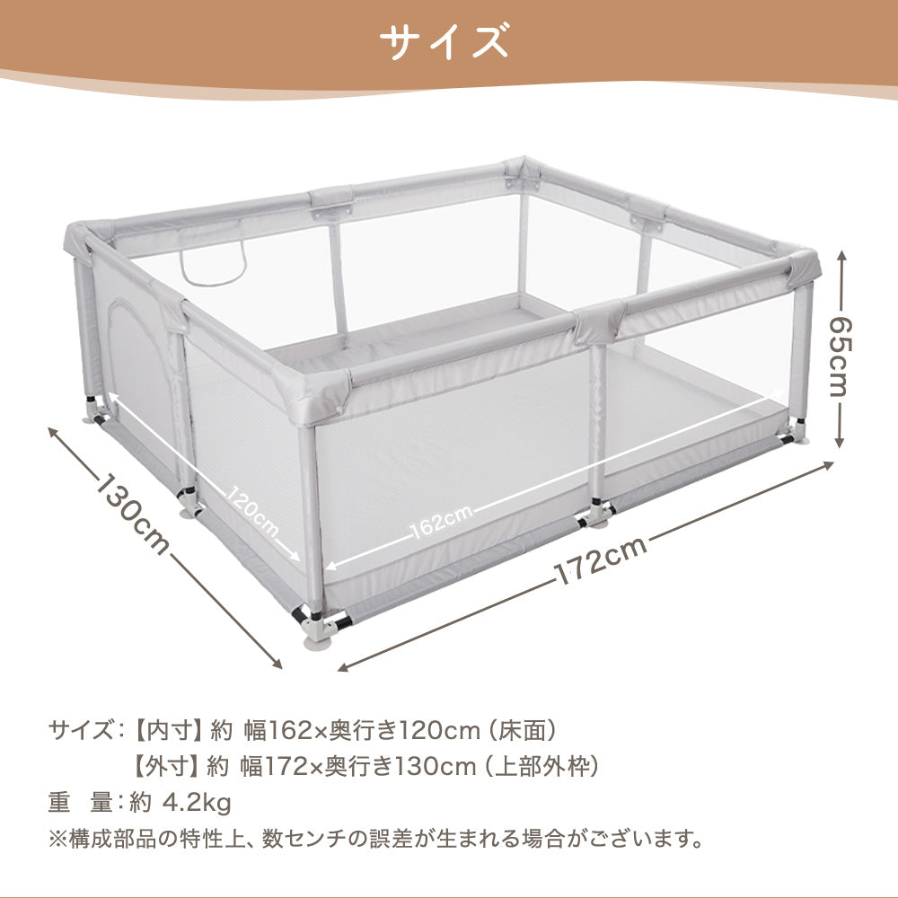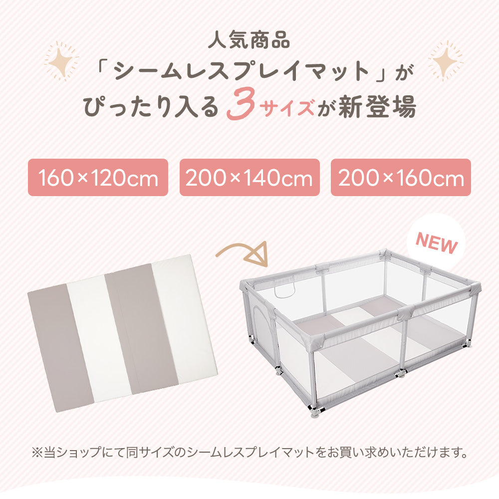 | 商品の特徴 | ・側面がメッシュのベビーサークルで、お子さまの様子が見えやすい ・当社シームレスプレイマットがぴったり入る新サイズ ・家事や入浴、どうしても外せない用事の時のお子さまの待機場所にぴったり ・キッズスペースとして使えば、散らかるおもちゃも簡単お片付け ・軽いので移動や掃除がらくらく ・工具がいらない簡単組み立て構造 ・天面、側面は柔らかいスポンジ付きのフレーム ・床面パーツには吸盤がついていて、ズレにくく倒れにくい ・外側からのみ開くファスナー式出入り口 ・便利な小物ポケット付き ・取り外して洗濯できるカバー |
