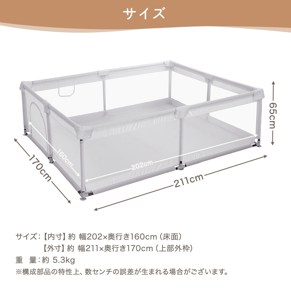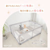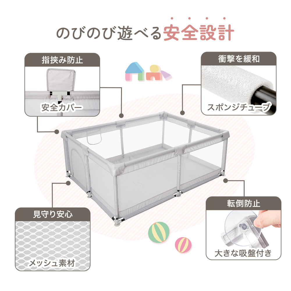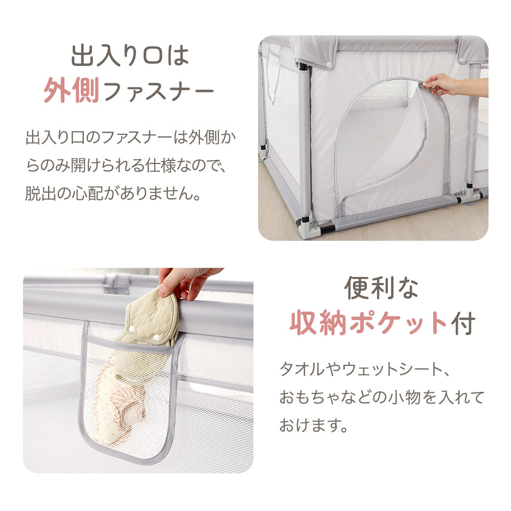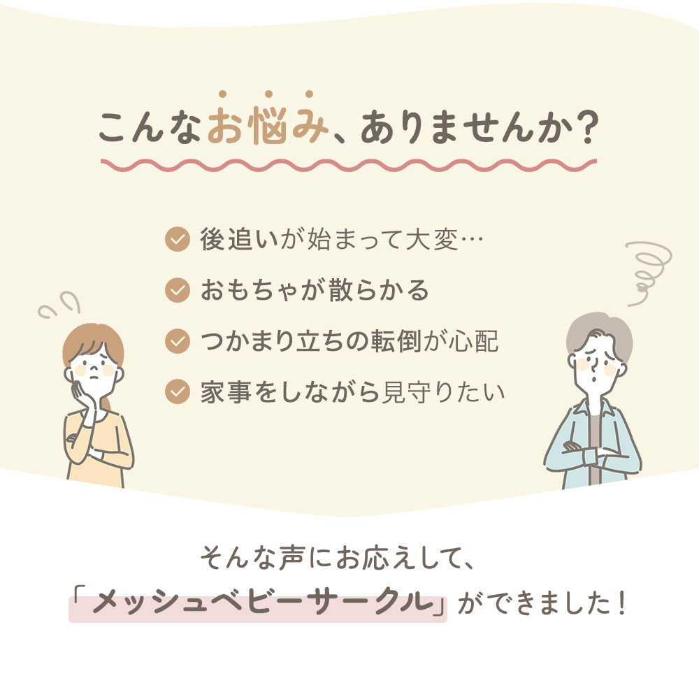 | 商品の特徴 | ・側面がメッシュのベビーサークルで、お子さまの様子が見えやすい ・当社シームレスプレイマットがぴったり入る新サイズ ・家事や入浴、どうしても外せない用事の時のお子さまの待機場所にぴったり ・キッズスペースとして使えば、散らかるおもちゃも簡単お片付け ・軽いので移動や掃除がらくらく ・工具がいらない簡単組み立て構造 ・天面、側面は柔らかいスポンジ付きのフレーム ・床面パーツには吸盤がついていて、ズレにくく倒れにくい ・外側からのみ開くファスナー式出入り口 ・便利な小物ポケット付き ・取り外して洗濯できるカバー |