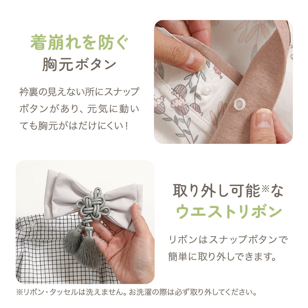 【トップス・リボン】麻55%、綿45%【衿・紐】綿100%【ボトムス】ポリエステル65%、綿35%【タッセル】ポリエステル100%【スナップボタン】ポリアセタール