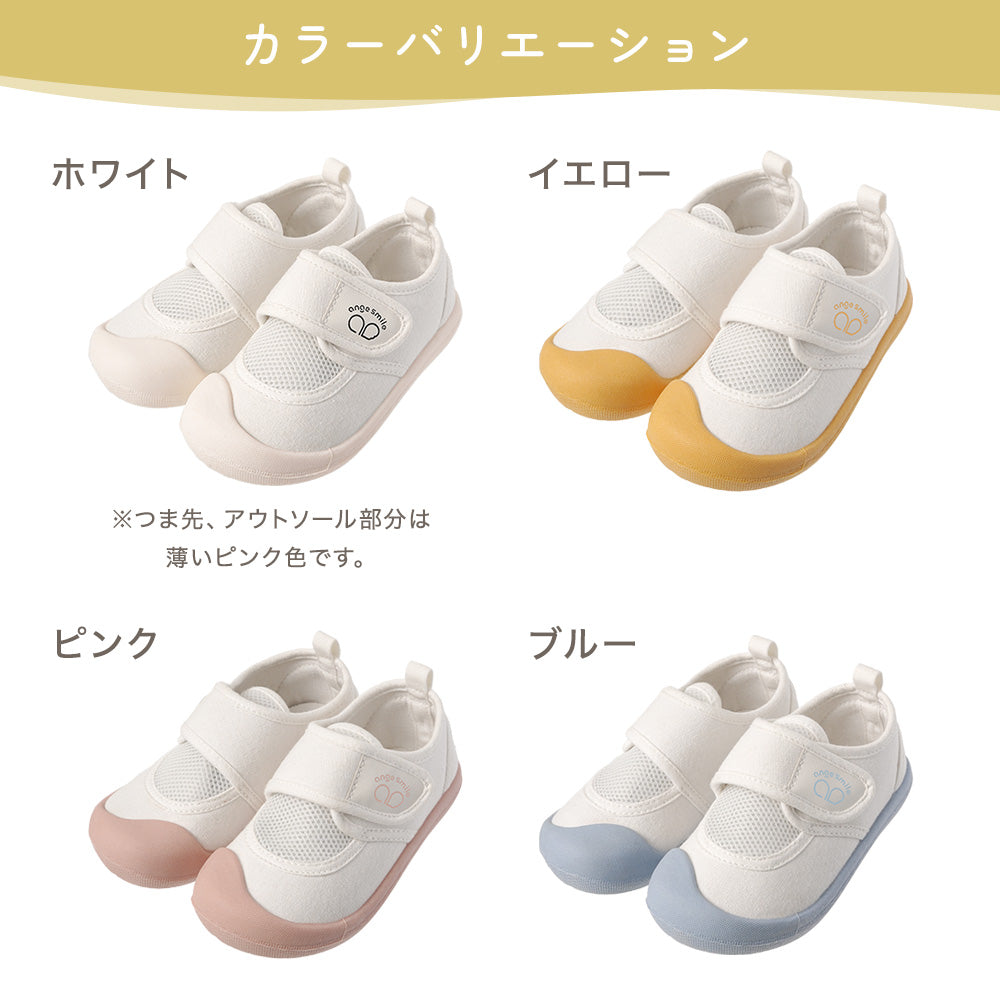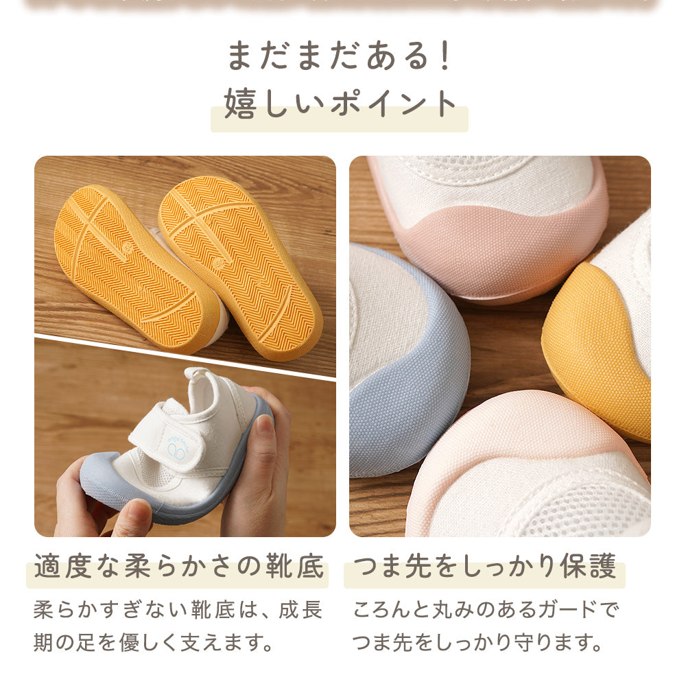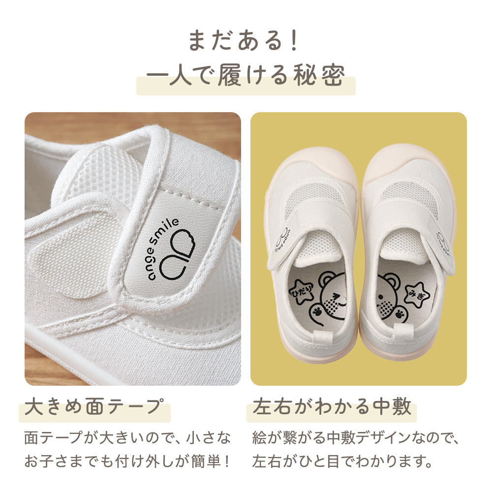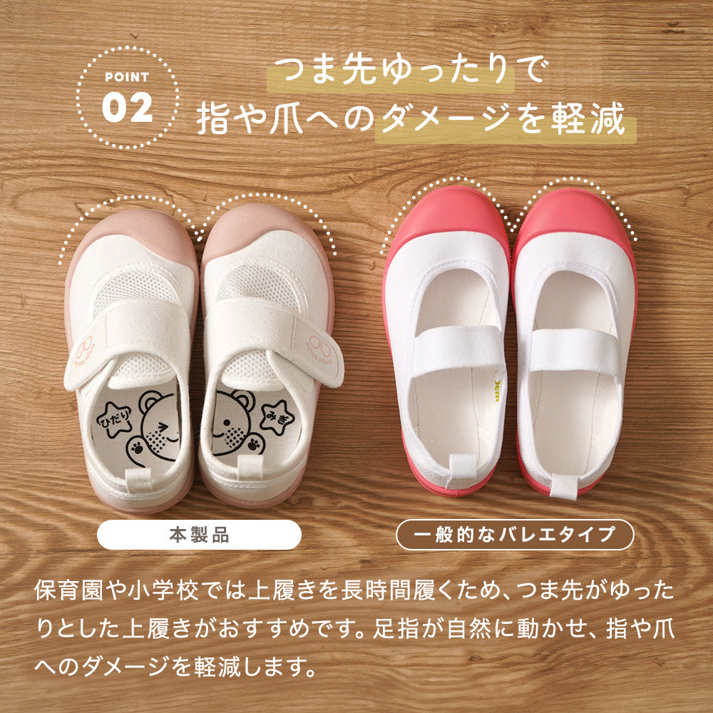 | 商品の特徴 | ・ひとりでも履きやすいベルト式上履き。 ・左右の履き間違いを防ぐイラスト入り中敷。(交換用に1足分を別途付属) ・足指を締め付けない、ゆったりしたつま先。 ・通気性の良いメッシュ素材を使用。 |