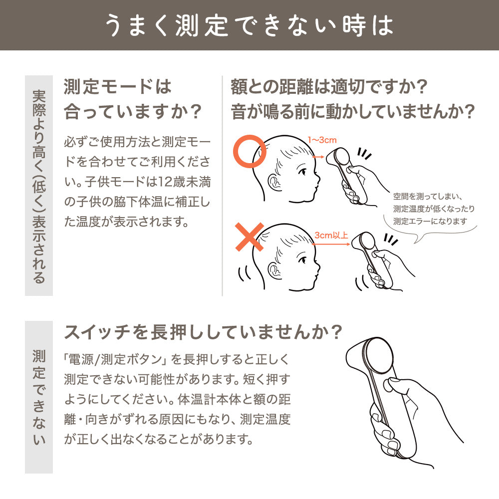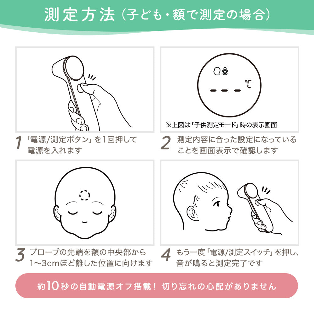 | 使用方法 | 【体温の測定】 1. 測定モード切替ボタンで「大人体温測定モード」もしくは「子供体温測定モード」に切り替えます。 2. プローブの先端を、皮膚の表面から1〜3cm離した位置で額の中央部に向けます。 3. 額と本体を動かさないようにして、電源/測定ボタンを短押しして測定します。 【物体表面温度の測定】 1. 測定モード切替ボタンで「物体表面温度測定モード」に切り替えます。 2.プローブの先端を、対象物の表面から1〜3cm離した位置で対象物の中心部に向けます。 3. 本体を動かさないようにして、電源/測定ボタンを短押しして測定します。 |