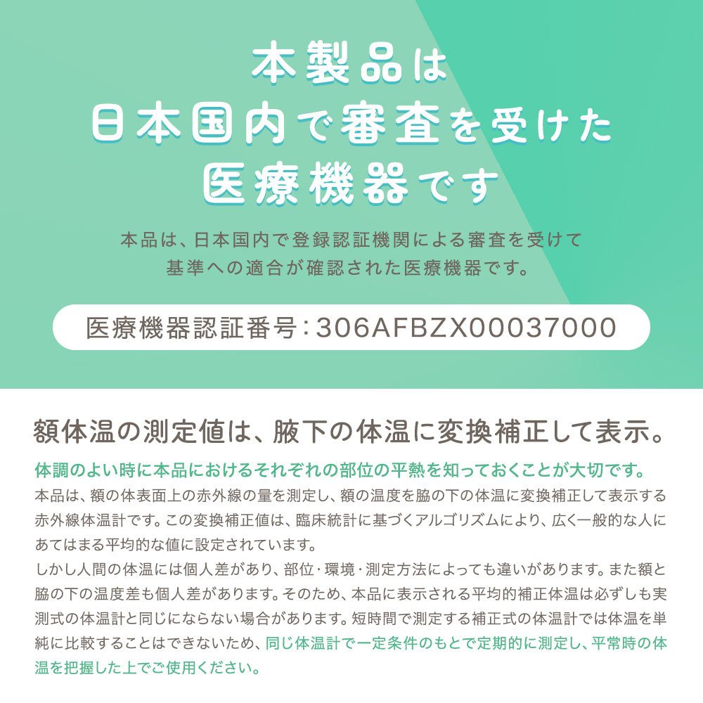 | 最大許容誤差 | (体温測定) ±0.2℃(36.0℃〜39.0℃) / ±0.3℃(上記以外の測定範囲) (物体表面温度) ±1.0℃ |