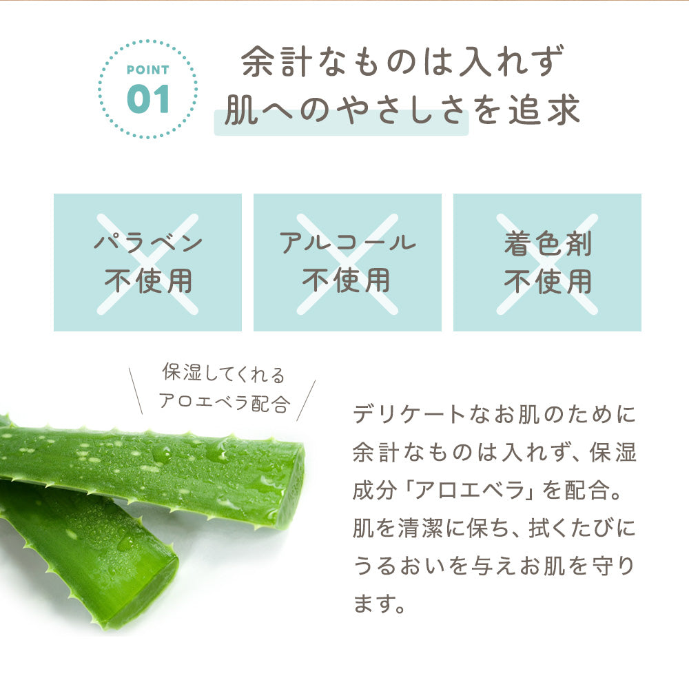 | 成分 | 水、フェノキシエタノール、クロルフェネシン、塩化ベンザルコニウム、エチルヘキシルグリセリン、アロエベラ葉汁、キシリトール |