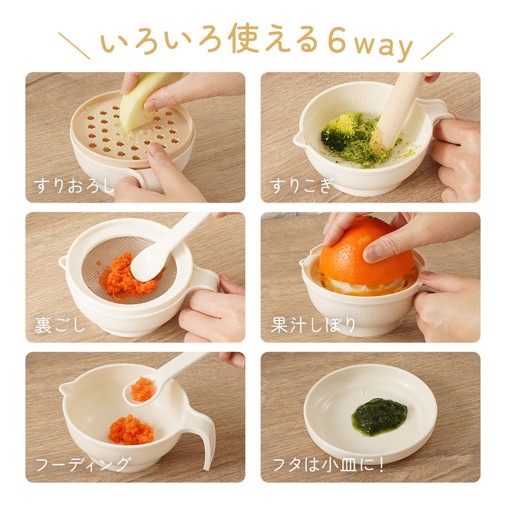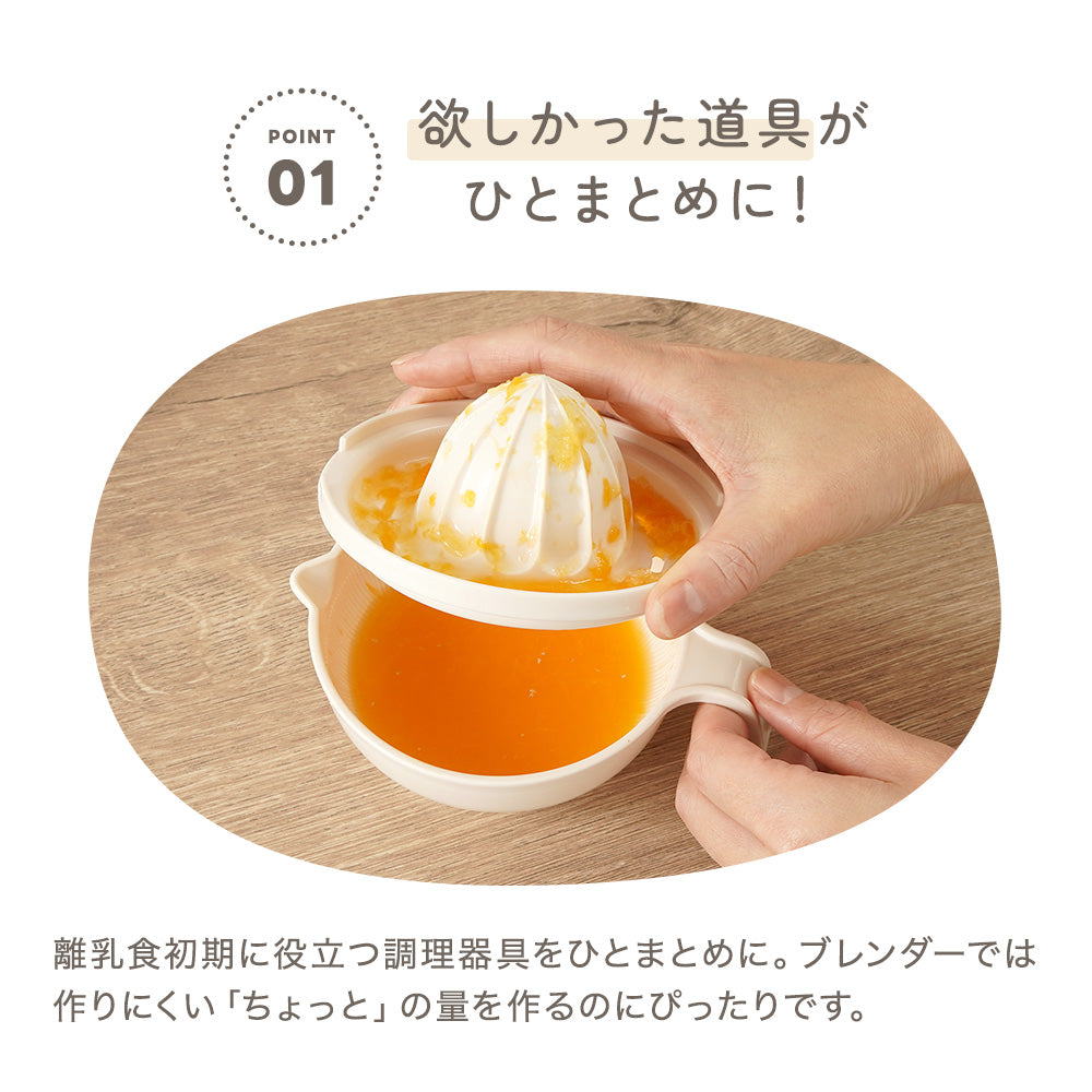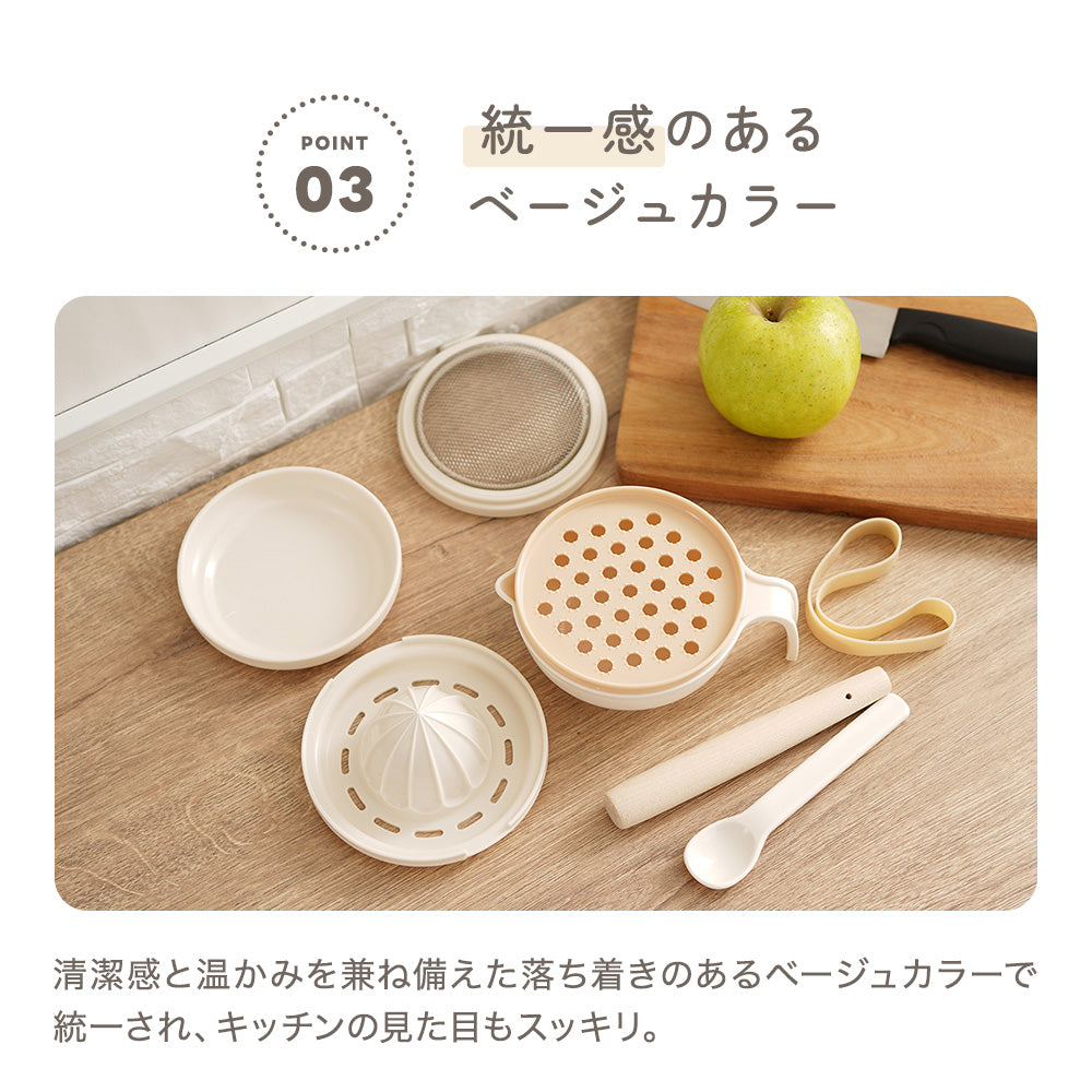 | 商品の特徴 | ・初めての離乳食作りに、離乳食初期に最適な調理器セット。 ・すりおろし、すりこぎ、裏ごし、果汁しぼり、フーディングがしやすい! ・重ねてひとまとめに収納OK。 ・統一感のあるベージュカラー。 ・裏面滑り止めで安定感をプラス。 |