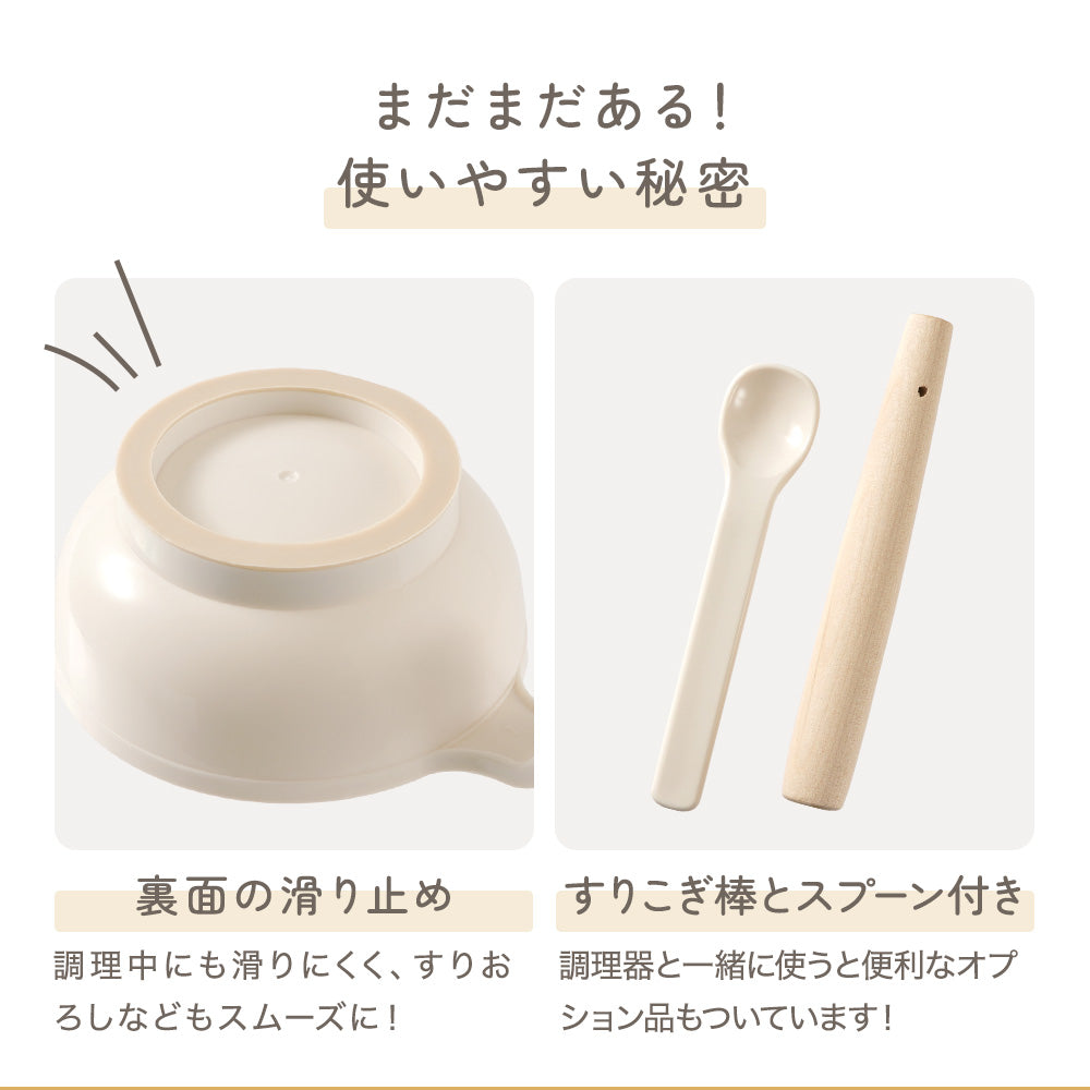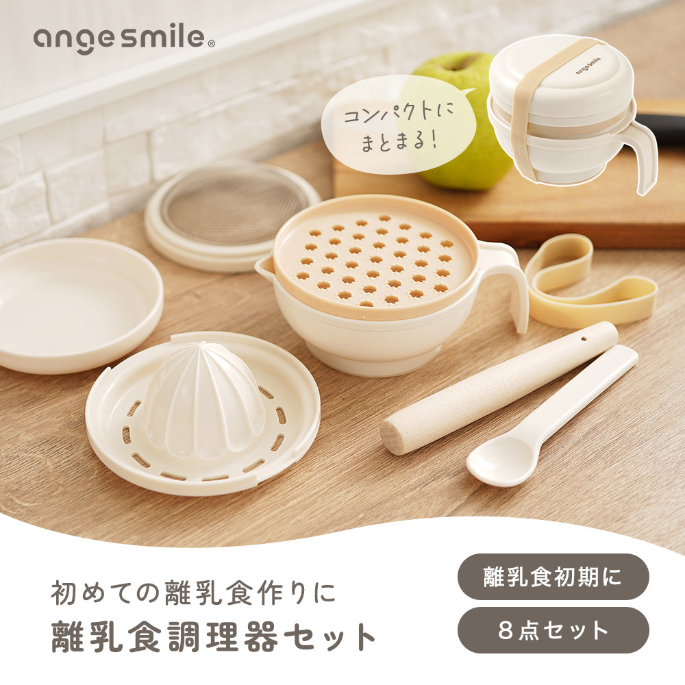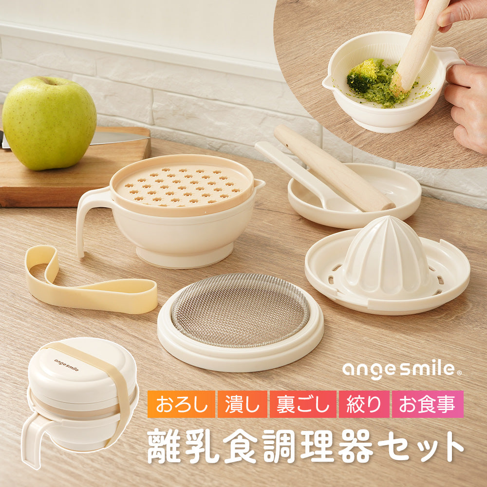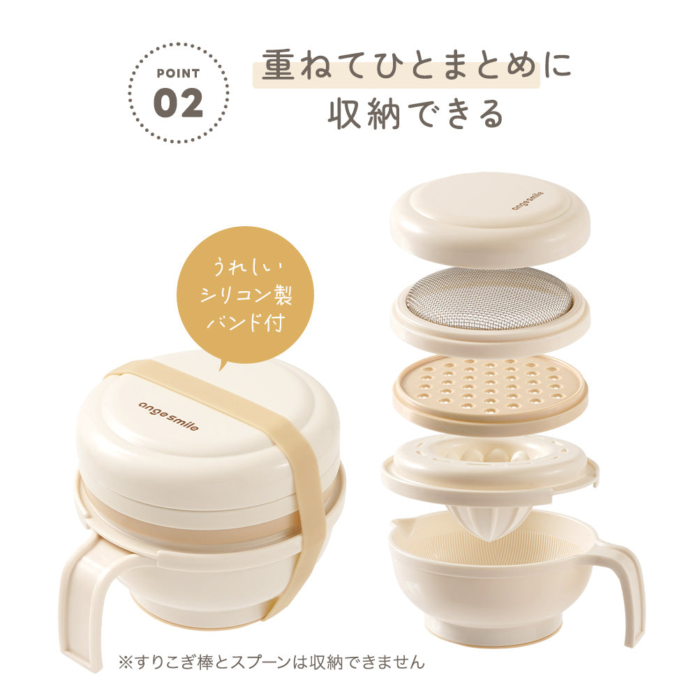 | 商品の特徴 | ・初めての離乳食作りに、離乳食初期に最適な調理器セット。 ・すりおろし、すりこぎ、裏ごし、果汁しぼり、フーディングがしやすい! ・重ねてひとまとめに収納OK。 ・統一感のあるベージュカラー。 ・裏面滑り止めで安定感をプラス。 |