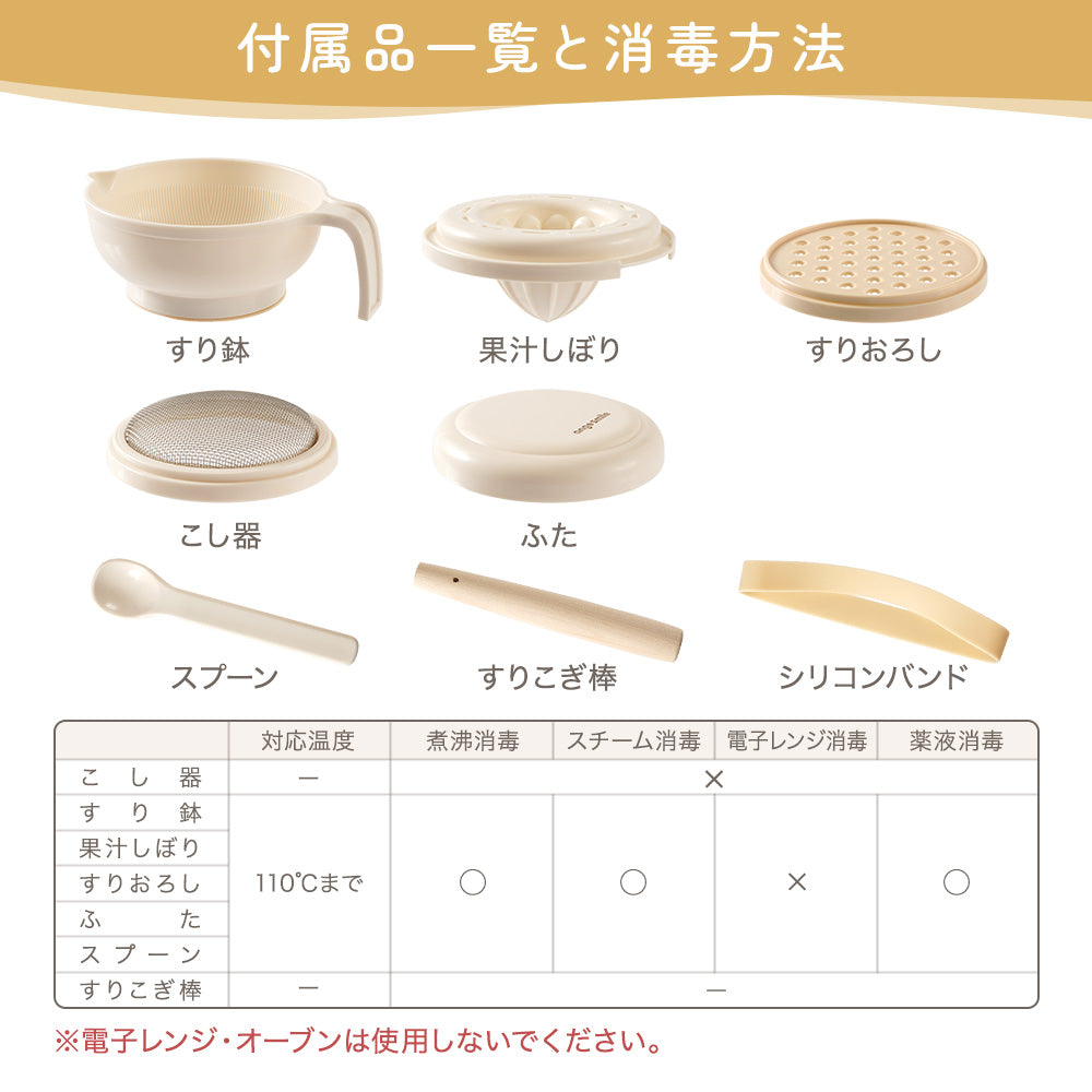 | 消毒方法 | 煮沸:○ 電子レンジ:× スチーム消毒:○ 薬液:○ ※こし網とすりこぎ棒は全て不可 |