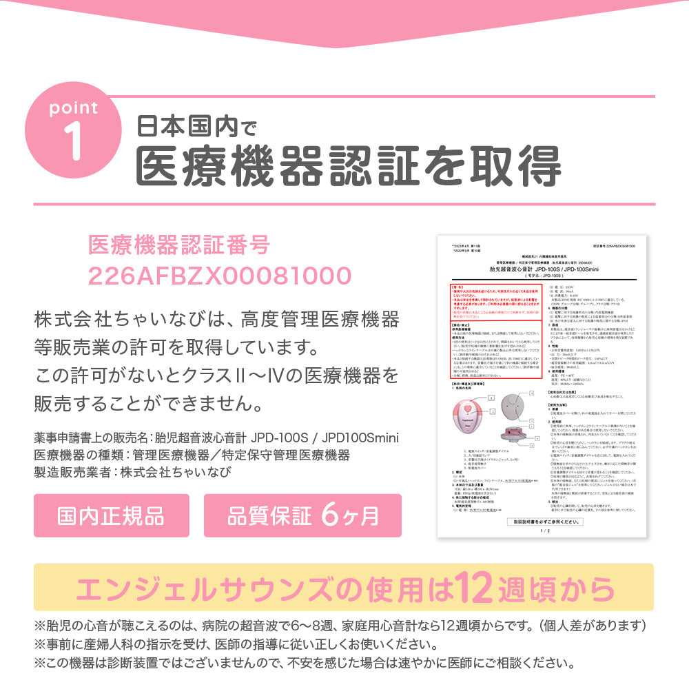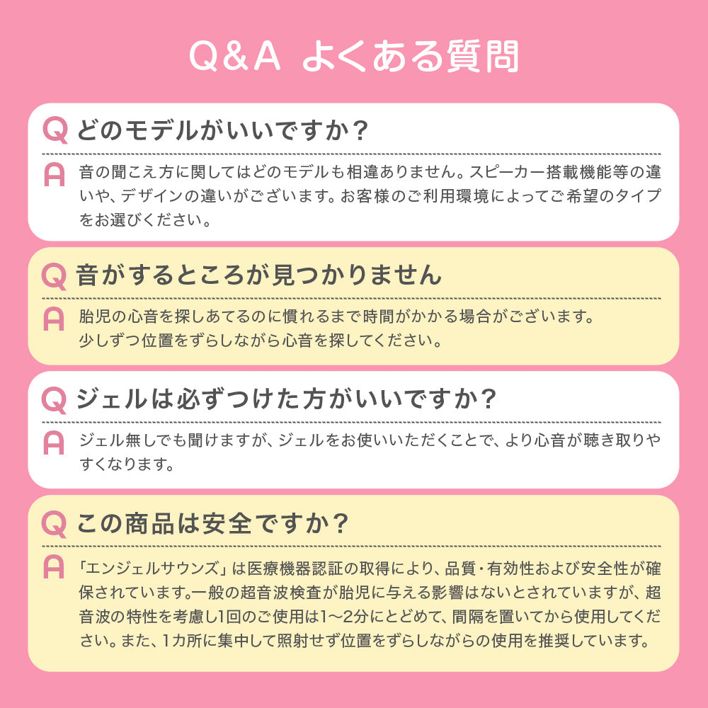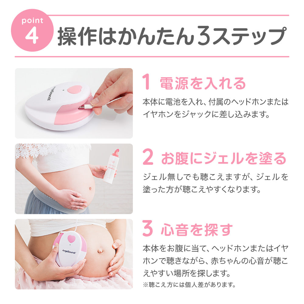 エンジェルサウンズはご家庭でお腹の赤ちゃんの心音を聞くことができる医療機器です。診断機器ではありませんが、赤ちゃんの心音が鳴っているのを聞くだけで、ほっと心を落ち着けることができます。