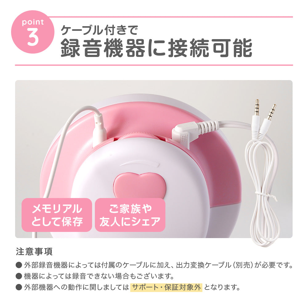 付属の録音ケーブルで録音機器に繋げば、赤ちゃんの心音を録音することもできます。(外部機器への接続は動作保証対象外となります)