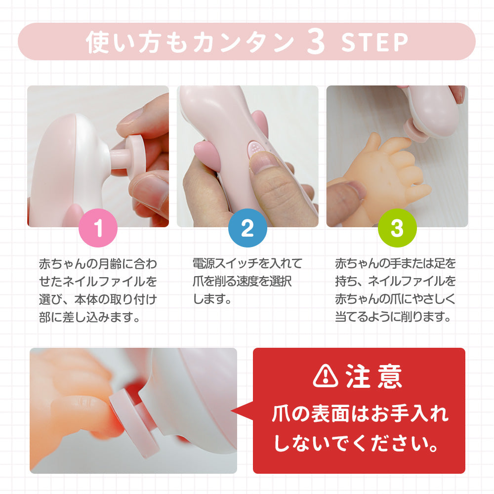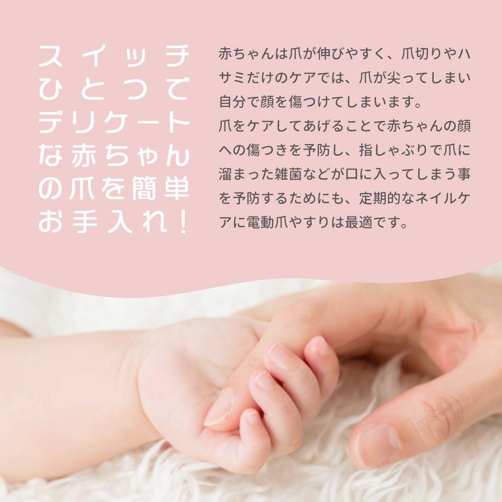 デリケートな赤ちゃんの爪も、スイッチをいれて当てるだけでお手入れできます。すぐに伸びてしまう赤ちゃんの爪をケアすることで、ケガや雑菌の繁殖を予防します。