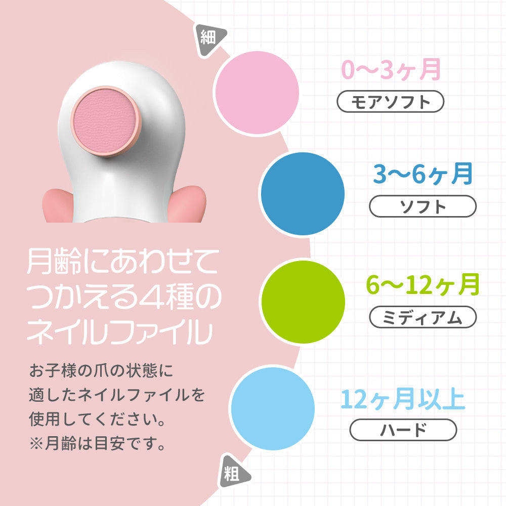 0~3ヵ月はモアソフト、3~6ヵ月はソフト、6~12ヵ月はミディアム、12ヵ月以上はハードと月齢に適したネイルファイルを使用できます。