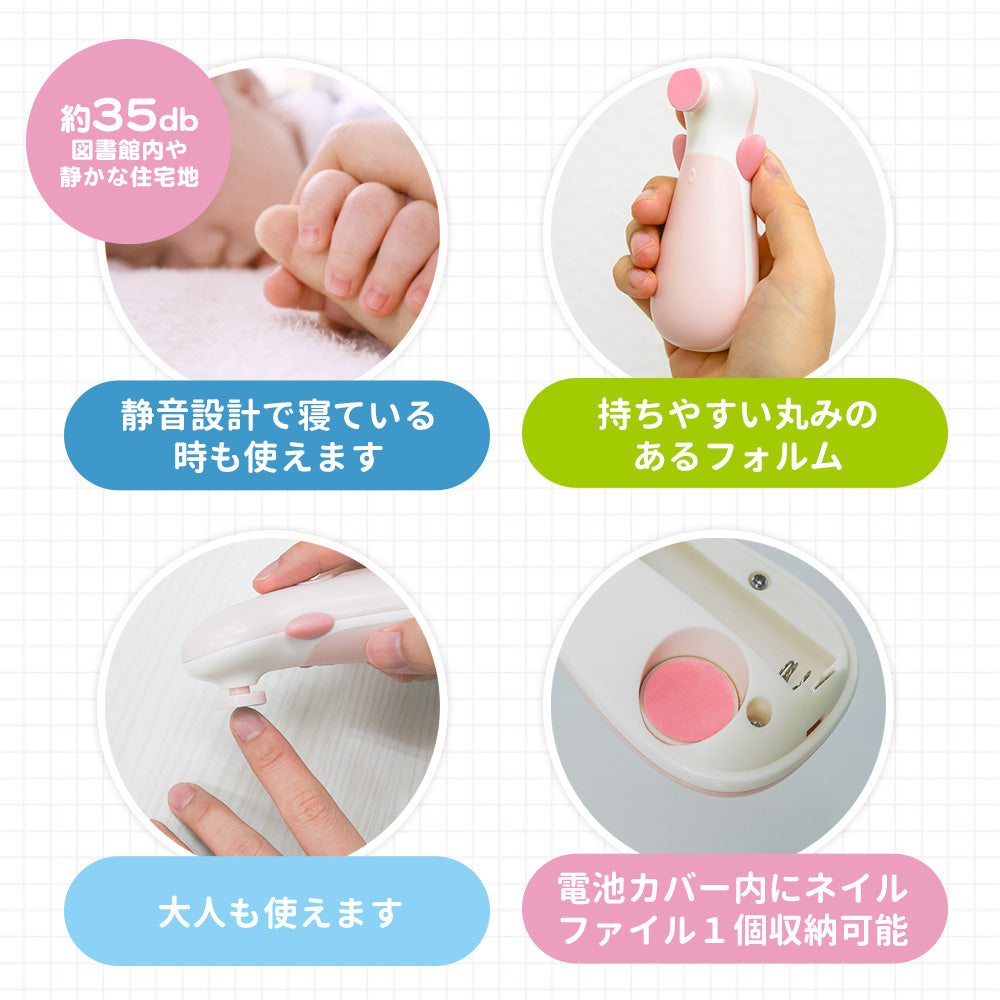 約35dbと図書館内や静かな住宅地レベルの音なので、嫌がる赤ちゃんの爪もケアしやすくなっています。