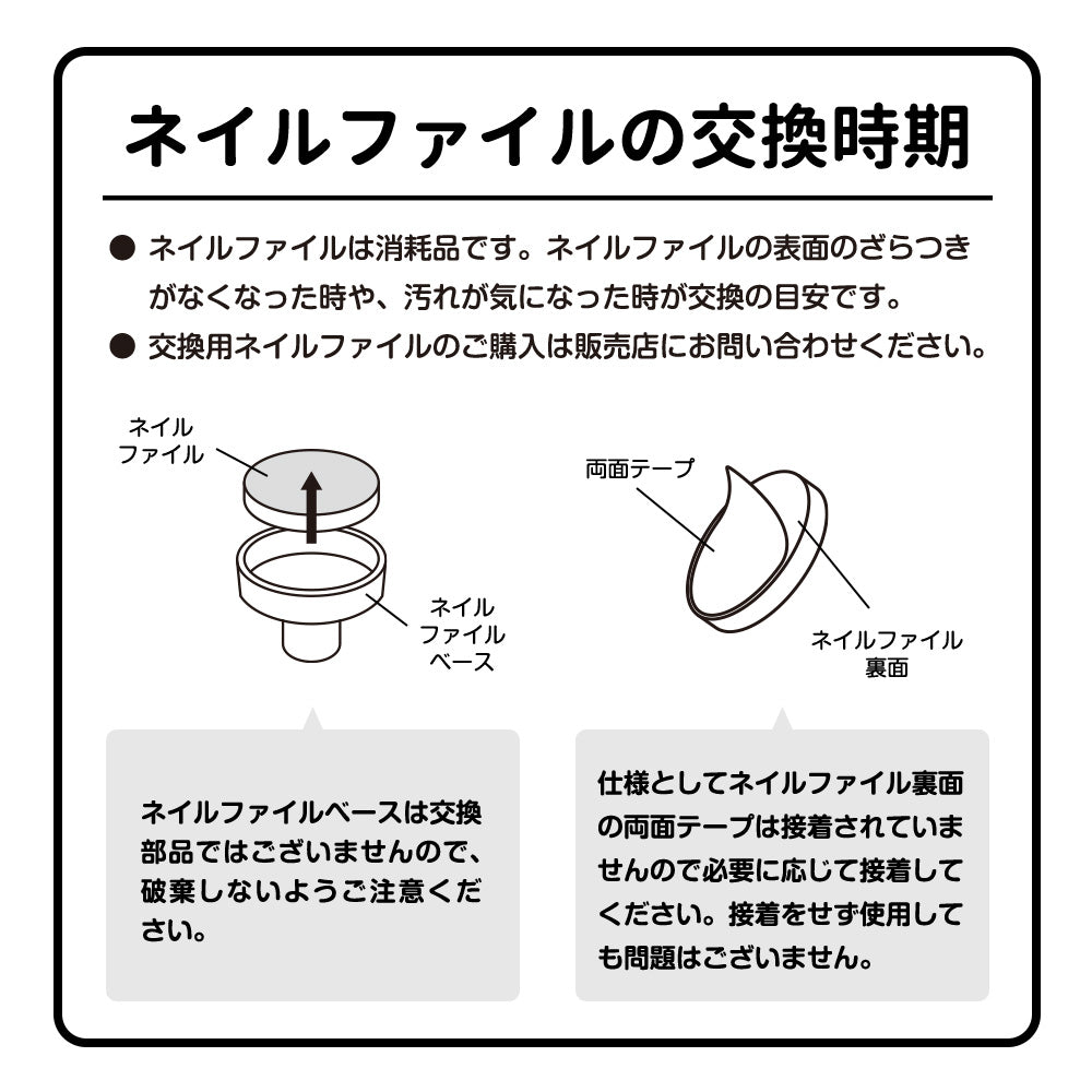 ・使用後にネイルファイルの汚れが気になった場合、乾いた布でふき取ってください。 ・本体・ケース・ネイルファイルが汚れた場合、乾いた布でふきとってください。水洗いはできません。 ・アルコール・シンナー・ベンジン等の溶剤を使用しないでください。 ・ネイルファイル取付部の溝は定期的に綿棒や乾いたやわらかい布でふき取ってください。 |