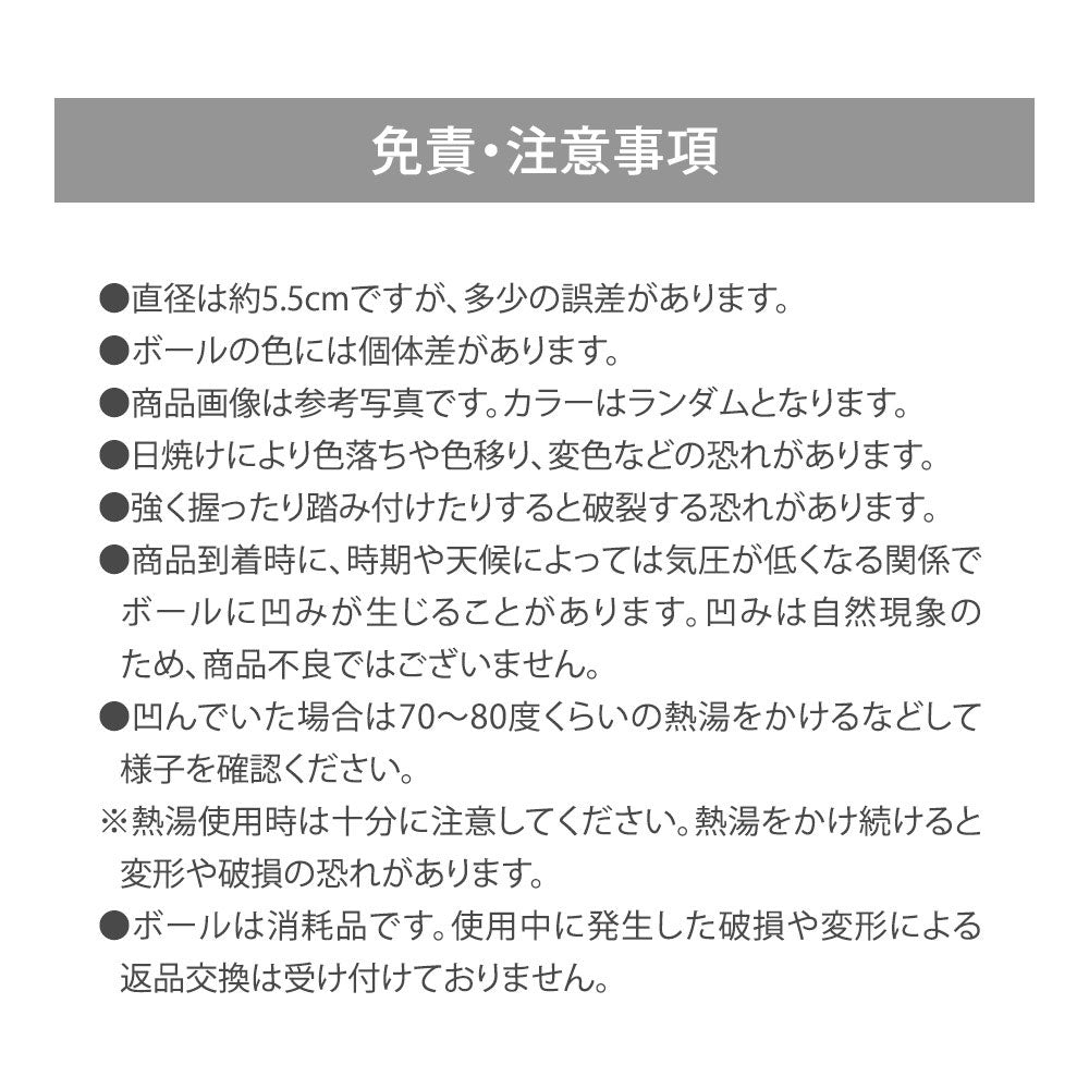| 免責・注意事項 | ●直径は約5.5cmですが、多少の誤差があります。 ●ボールの色には個体差があります。 ●商品画像は参考写真です。カラーはランダムとなります。 ●日焼けにより色落ちや色移り、変色などの恐れがあります。 ●強く握ったり踏み付けたりすると破裂する恐れがあります。 ●商品到着時に、時期や天候によっては気圧が低くなる関係でボールに凹みが生じることがあります。凹みは自然現象のため、商品不良ではございません。 ●凹んでいた場合は70〜80度くらいの熱湯をかけるなどして様子を確認ください。 ※熱湯使用時は十分に注意してください。熱湯をかけ続けると変形や破損の恐れがあります。 ●ボールは消耗品です。使用中に発生した破損や変形による返品交換は受け付けておりません。 |