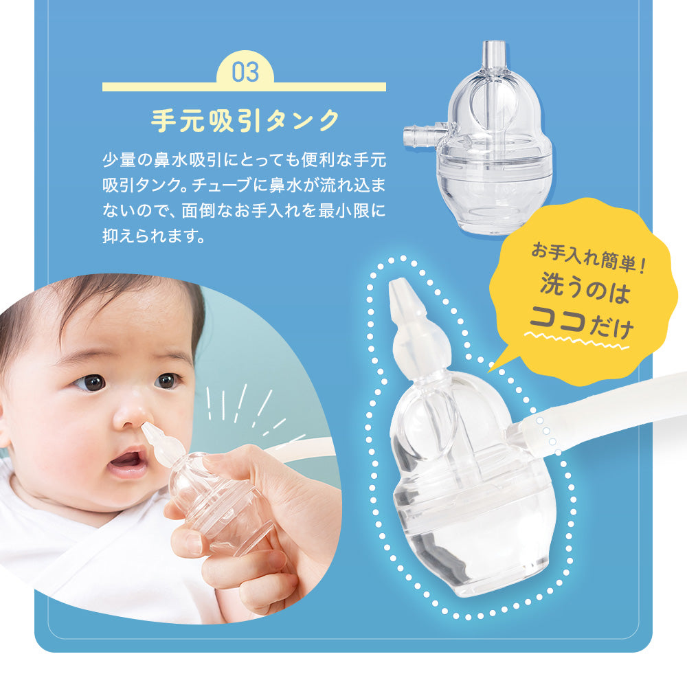 | 使用上の注意 | ●在宅において使用する場合は医師の指示に基づいてご使用ください。 ●本品は鼻汁を吸引するための機器です。乳幼児の口や耳には使用しないでください。 ●乳幼児が、小さな部品や付属品を誤って飲み込まないように注意してください。 ●乳幼児や子供の手の届かないところで、本品を保管してください。 ●使用前に、本体とシリコーンチップに傷や汚れがなく、清浄な状態で あることを確認してください。本体やシリコーンチップが汚損している場合には、使用しないでください。 ●使用前と使用後には、常に本品をきれいに洗浄して、乾燥させてください。 ●シリコーンチップを鼻孔に挿入するときには、鼻孔内部に傷をつけないように注意して、ゆっくり挿入してください。また、シリコーンチップを鼻孔に深く挿入しないでください。 ●本品を乳幼児に使用する場合には、1回に5秒以内を目安に吸引してください。鼻に損傷を与える恐れがあります。 ●シリコーンチップは共用しないでください。 |