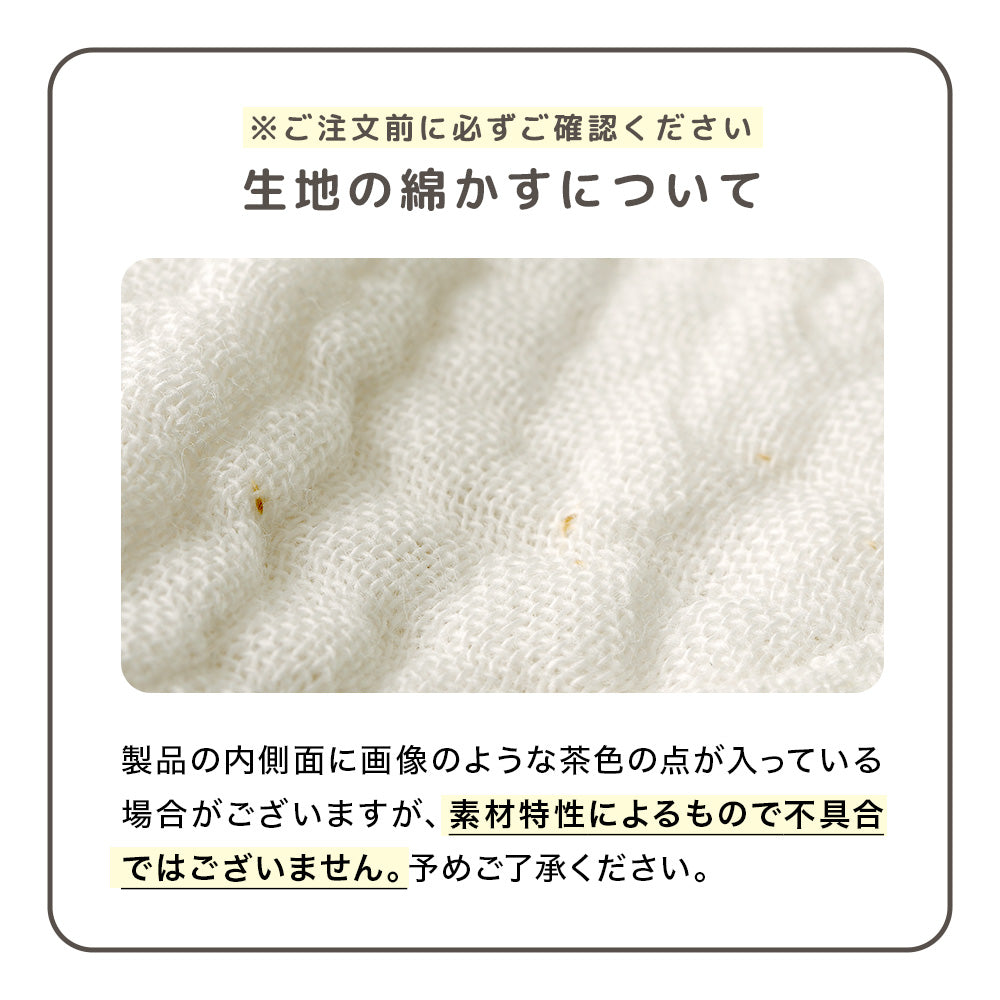 | 使用上の注意 | ・強く引っ張ったり、物に引っかかったりすると、ほつれる場合がございます。 ・ガーゼ素材の特性上、洗濯後に多少の縮みが発生します。 ・色ごとに多少の個体差がございます。ご了承ください。 |