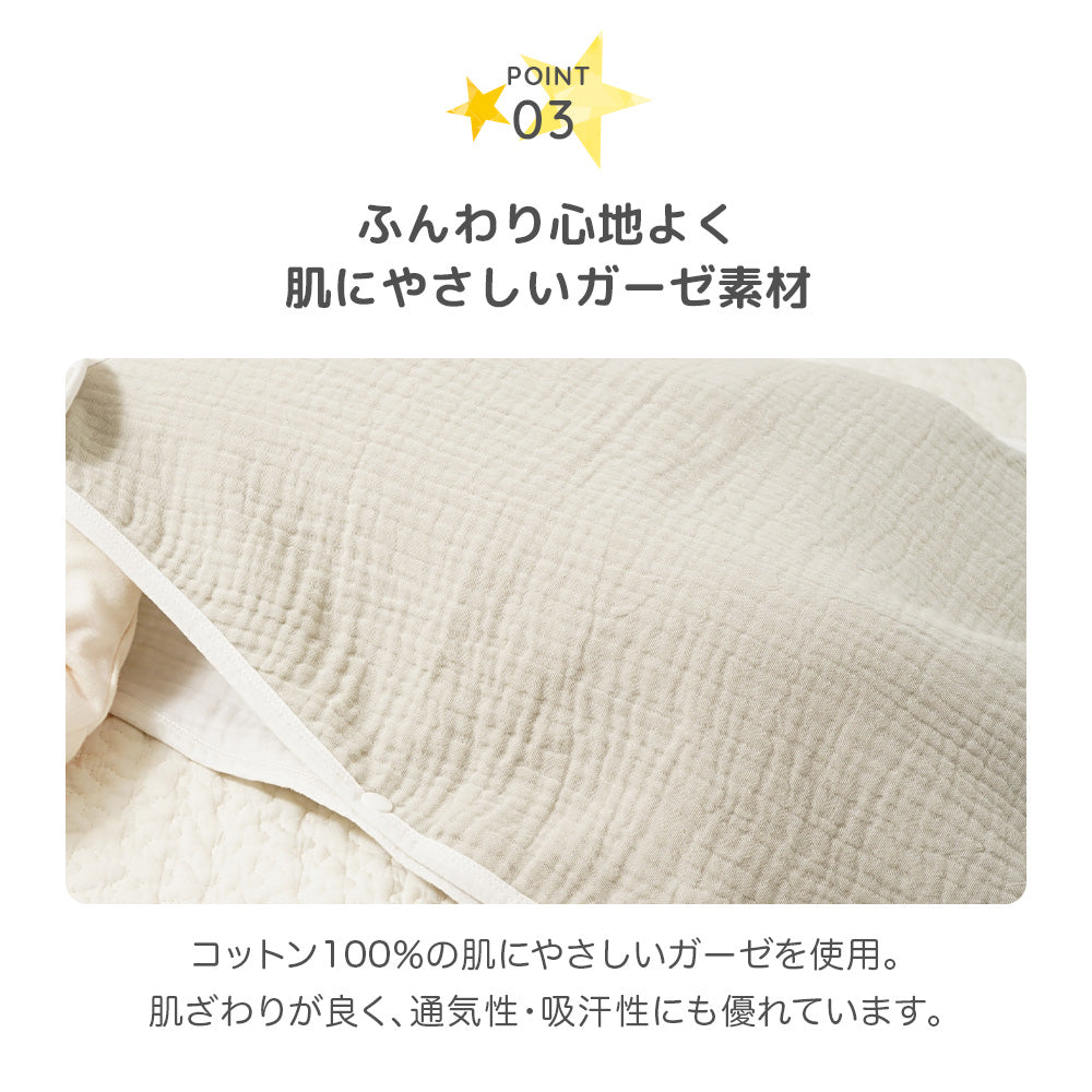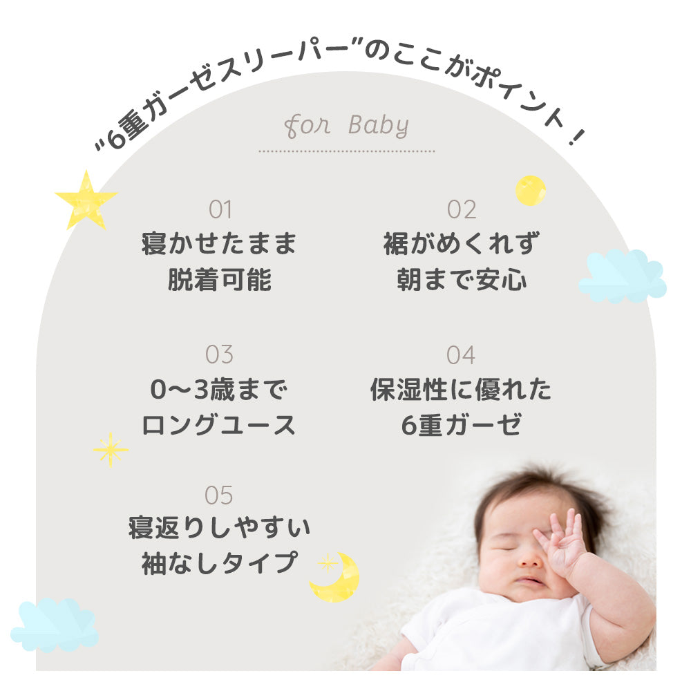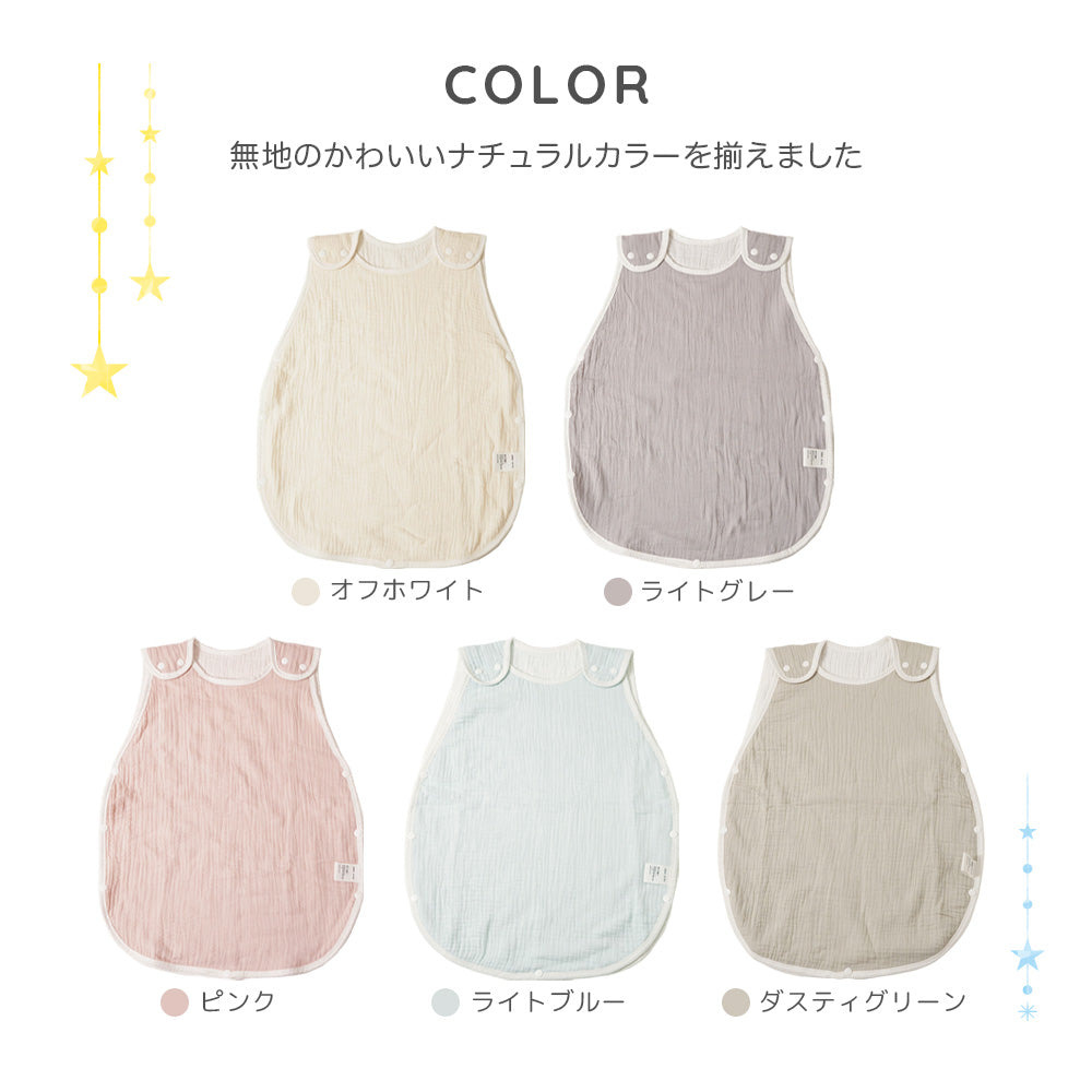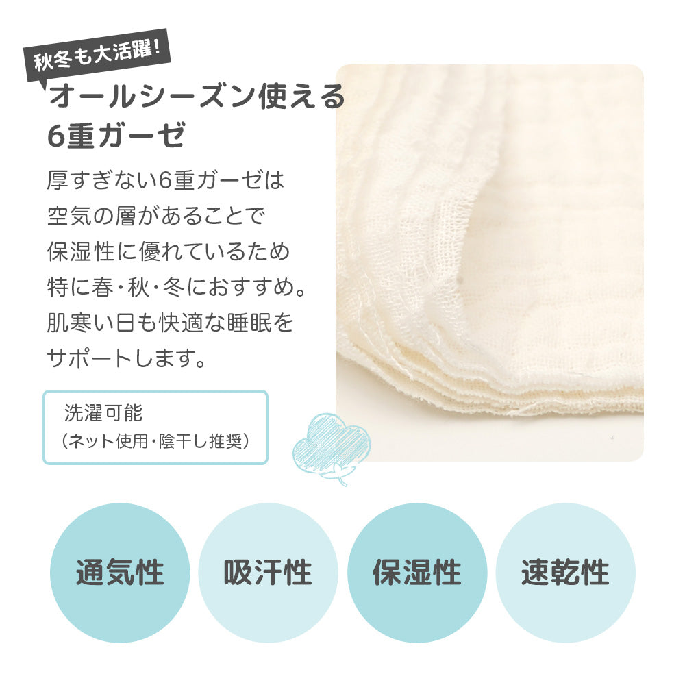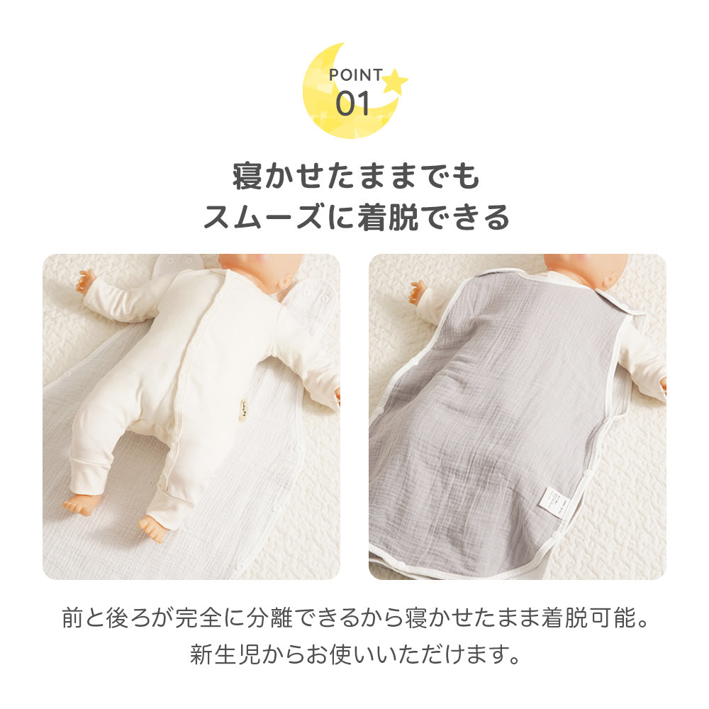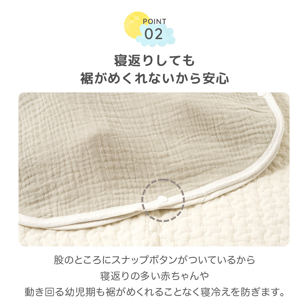 | 商品の特徴 | ・分離タイプで着脱もラクラク。全てのスナップボタンを外すと前と後ろで分離します。寝かせたままの状態でも着脱でき、首がすわる前の赤ちゃんのお着替えも簡単です。 ・股下のめくれ防止スナップ付きで寝冷え対策に。 ・肌ざわりが非常に良く、保湿性・速乾性に優れています。 ・綿100%なので吸湿性もバツグンです。 ・春の肌寒さ、真夏の冷房による冷え、秋冬の寒さなどからくる肩やお腹の冷え対策に。 ・6重ガーゼを採用。空気の層が多く保温性に優れており、オールシーズンで使用できます。 ・タグは直接肌に当たらない場所にあり、手で簡単に引きちぎることもできます。 |
