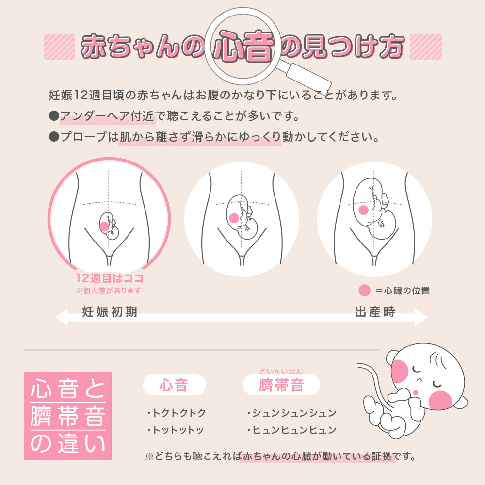 | 使用上の注意 | ・事前に産婦人科医の指示を受け、医師の指導に従い正しくお使いください。 ・取扱説明書に記載されている警告と内容を確認してお使いください。 ・本品は安全を考慮して設計されていますが、超音波による影響を考慮して1回のご利用を5分以内としてください。 ・超音波ジェルを使用すると音の通りがよくなりますため、音量調整にはご注意ください。 |