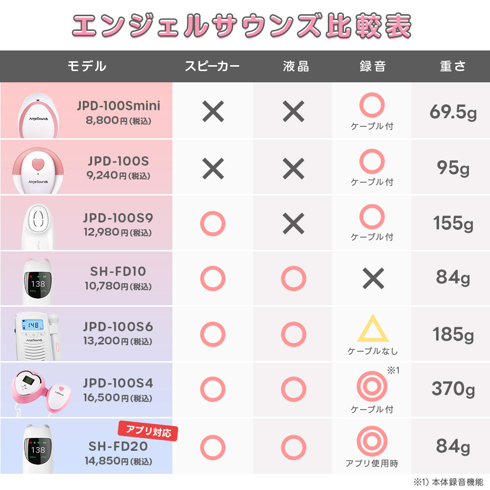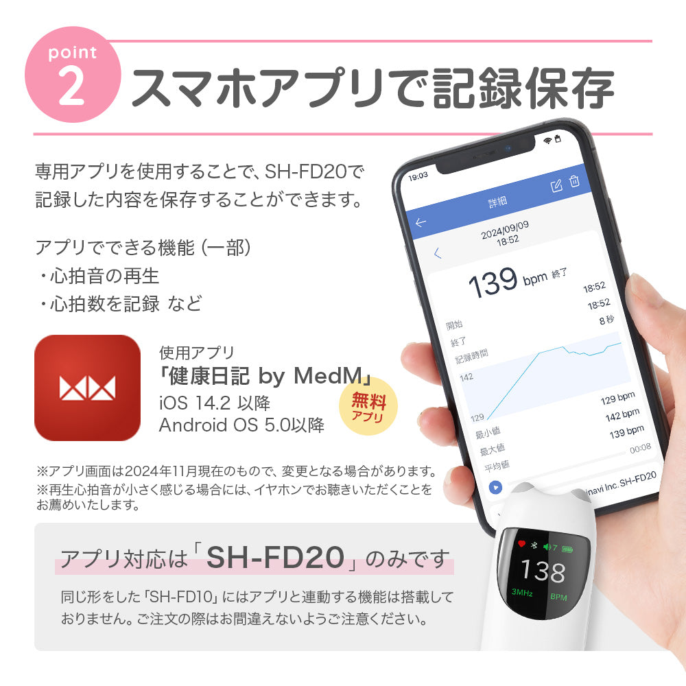 | 商品の特徴 | おうちのリラックスした状態で、ご家族と一緒に赤ちゃんの心音が聴ける胎児超音波心音計です。 ・スマホアプリで記録保存。 ・心拍数などがわかる液晶表示。 ・スピーカー内蔵モデル。 ・小さくて持ちやすい形。軽くて持ち運びしやすい! ・オートパワーオフ機能(約60秒) |
