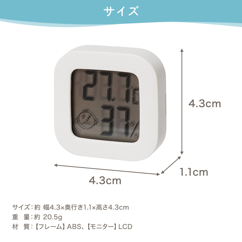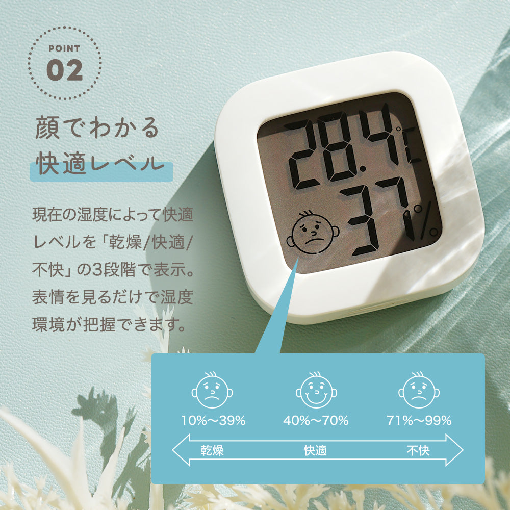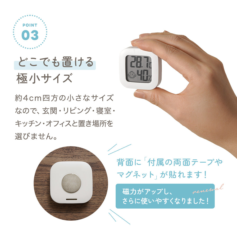 | 商品の特徴 | ・極小サイズでどこにも置ける温湿度計 ・一目で室内環境がわかる ・快適レベルをイラストで表示 ・マグネット&両面テープで貼り付けOK |